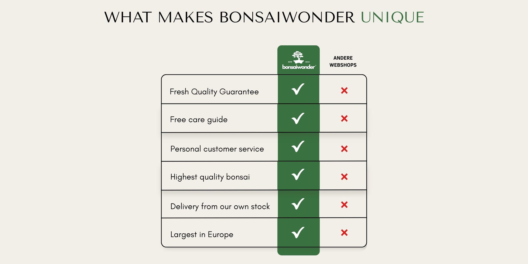 We believe that, with the right care, anyone can successfully care for a bonsai. To reinforce this confidence, we offer our unique '60-day Bonsaiwonder Guarantee'. From the moment your bonsai is delivered to your home, you are covered by a 60-day guarantee period during which we will help you with caring for your bonsai. If your bonsai dies within this period, we will replace it free of charge, or we will offer you a voucher to use on our website.